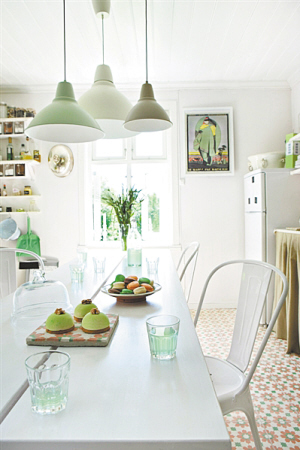 绿野仙踪式的厨房,温润的绿色装饰随处可见,吊灯、水杯、插花、糕点和墙面装饰画,浅浅的薄荷绿色在家中蔓延,在舒适的白色厨房背景衬托下,更显自然清新。