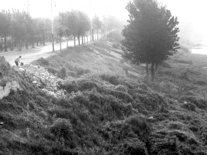7月8日6时许,记者在八一大道桥附近的河堤看到,一位市民正将一桶垃圾倾倒在河堤边上(如图)。随后,记者沿颍河路向东查看,发现八一大道至大庆路之间的这段河堤面向河道的斜坡上,分布着数个大小不等的生活垃圾堆,与沙颍河两岸的优美环境格格不入。