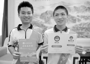 7月9日,柳艳兵(右)和易政勇分别收到来自南昌大学和江西财经大学的录取通知书。