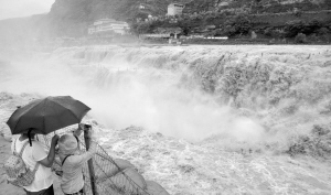 7月9日,游客们在拍摄壶口瀑布。