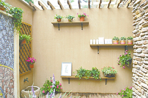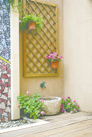 定做一面木格栅挂在墙上,种些攀爬植物缠绕在木格栅上或将小型绿色盆栽挂在镂空的格子上,无论是赏花观叶,都别有情调。