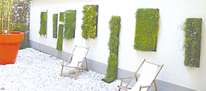 墙面绿化除了种植爬藤植物外,还可将草坪移植到墙上,将长方形、菱形等几何图案的草坪“挂”在墙上,不仅提高了观赏性,成为墙面的独特装饰,与地面植物相呼应也打造了一个立体花园。