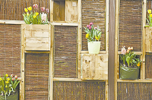 由木条和藤条组成的景观墙,设计凹凸造型的小木箱或收纳格,摆放小型盆栽或插些鲜花,给墙面带来别致的风景。