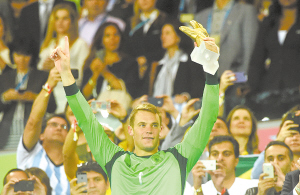 当地时间7月13日,德国队守门员诺伊尔在颁奖仪式上获颁“金手套”奖后庆祝。当日,在巴西里约热内卢马拉卡纳大球场进行的2014年巴西世界杯决赛中,德国队与阿根廷队在90分钟内战成0∶0平。最终通过加时赛,德国队以1∶0战胜阿根廷队,获得冠军。