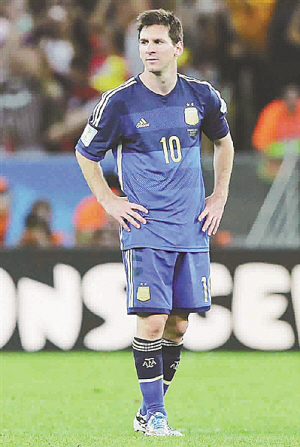 那一头,梅西黯然神伤(见右图)。当人们都在期待一个新球王的诞生之时,梅西无力承担。他最终还是无法完成像马拉多纳一样的伟业,完成真正的王者加冕。