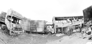 公安与民政部门的技术人员在大客车上收集遇难者遗骸,携带司法鉴定箱的工作人员在测量车辆数据。现场的一位警察告诉记者客车由于车厢里气味过于刺激,现场处置的警察不得不每半小时换人上车。