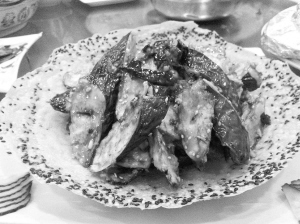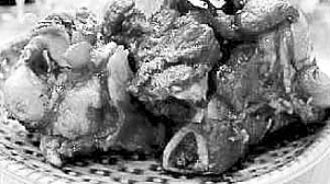品菜团跻身众多食客中,首当其冲的是点招牌菜,不大一会儿,服务员端着一大盘热腾腾的酱骨头,送到我们面前,浓郁的酱香夹着肉味扑鼻而来,服务员给每个人递上一双专门啃骨头的薄膜状的手套,大伙儿几乎是抢光盘中骨头。骨头为特大的脊骨,骨肉香筋,色泽鲜美,入口软烂。骨中有骨髓的,插入一根吸管吸食,其味妙不可言,很有“大块吃肉”的感觉。