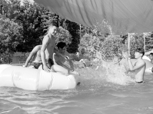 几名学生在市体育中心一处露天游泳池中嬉戏