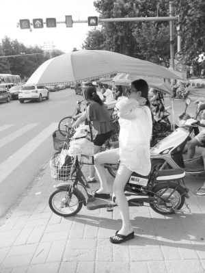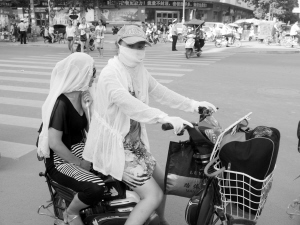 在市区街头,许多市民穿上防晒衣或撑起遮阳伞。游泳池则成为市民的避暑乐园。