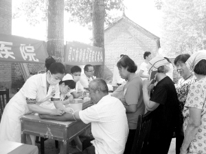为更好地践行党的群众路线,扎实开展“走基层”活动,7月17日上午,市卫生局卫生监督局组织30多名医务工作者,冒着酷暑来到淮阳县安岭镇绪寨行政村,为这里的村民送来药品,并为他们免费进行健康体检。 晚报记者 张志新 摄