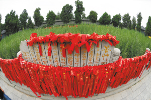在伏羲之陵墓后方,有一个蓍草园。我们看到,在夏日骄阳下,蓍草一片葳蕤,周边的青石护栏上系满了人们用以祈福的红丝带。