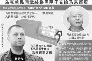据国际文传电讯社22日报道,乌克兰东部民间武装领导人、“顿涅茨克人民共和国”总理博罗代22日凌晨将马航MH17航班客机的“黑匣子”交给马来西亚方面。根据双方签署的备忘录,马方应该将“黑匣子”转交给国际民航组织专家。