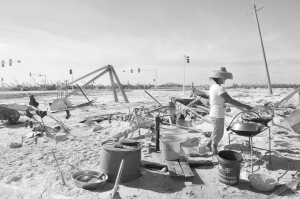 7月22日,海南省文昌市昌洒镇一名居民在风沙掩埋的工棚前做饭。