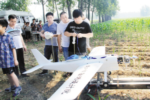 7月21日下午,在周口港口物流产业集聚区内的一块麦田里,工作人员调试好了“无人机”。一切准备就绪,随着一声令下,“无人机”顺利弹射起飞,标志着“无人机”首飞成功。