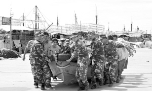 7月27日,在海南省文昌市清澜渔港码头,文昌公安边防支队清澜边防派出所干警帮助渔民搬运破损渔船。