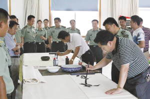 应官兵们的要求,书法家们欣然挥毫泼墨,现场创作,他们的作品受到官兵们的喜爱。
