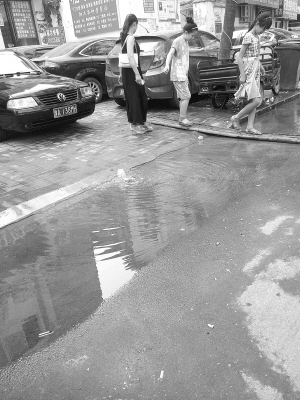 7月29日,有市民拨打本报新闻热线称,在周口市区七一路与工农路交叉口北20米路东的地方,一处自来水管道发生爆裂,一直没有人前来维修,清清的自来水都流淌一个星期了,看着真让人心疼。当日上午,记者赶到现场看到,在一家酒店门前,自来水喷出地面近10厘米高,附近路面都是积水。记者随后联系上周口“银龙”,一名工作人员告诉记者,他们马上派人维修。晚报记者 王凯 摄
