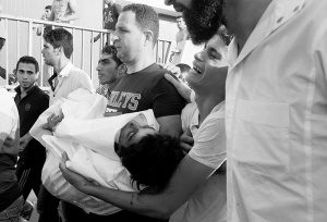 7月28日,在加沙城,一名巴勒斯坦人抱着一具被炸死的儿童尸体。