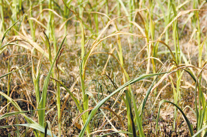图二:7月30日,在川汇区城北办事处一块地里拍摄的因缺水萎蔫的玉米苗。