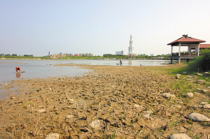 图一:周口公园的湖水出现干涸。7月30日,有市民赤脚在湖中拾田螺。