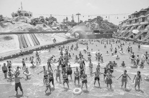 7月30日,一些市民和游客在冲浪池里跳广场舞。