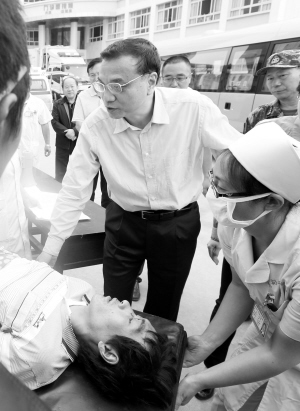 鲁甸县人民医院门前广场设置了伤员分诊台,李克强详细询问伤员收治、分诊和转运情况。这时,救护车又送来一名伤员,李克强俯身察看伤情,安慰他说,到医院就好了,医护人员一定有办法把你治好。