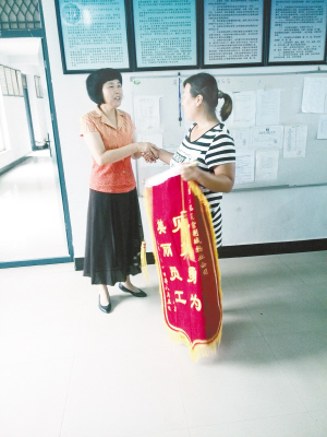 6日上午,老人的女儿特意买了水果和一面锦旗以表达对毛梨花的感谢。“我母亲说,当时她一个人在小区的人工湖边散步,觉得手上有点脏,就想到湖边去洗洗手。由于穿的是塑胶底的鞋,鞋底比较滑,我母亲踩到湖边的鹅卵石就滑了下去,身子整个侧歪在水中站不起来,连喝了好几口水,要不是毛梨花及时援手,后果不堪设想。一开始我母亲觉得是这里的邻居救了她,后来我打听到救她的原来是一位小区保洁员。”老人的女儿范玉敏激动地介绍事情的经过。