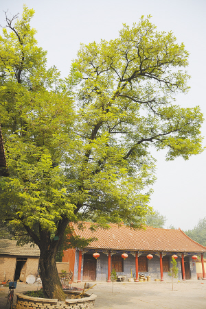站在大黄镇政府所在地附近的十字路口,向北眺望,一条笔直的大路直通古庙正门。行至大黄伏羲古庙门前,黄色庙墙让人心生虔诚。高大壮观的门楼令人肃然起敬,门前一人多高的石狮,煞是威武。大门上方“大黄庙”三字遒劲、沧桑,旁边一块写有“界首市重点文物保护单位”字样的匾牌见证了这里曾经厚重的文化。大门里左侧,一棵树龄130年的刺槐至今仍枝繁叶茂。