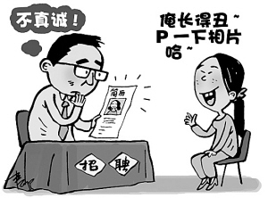 时下,修图软件流行,许多人的照片因此变得赏心悦目。不过,假如把求职照片也PS一下,会有什么后果?沈小姐前段时间在网上投简历找工作,特意用编图软件把照片美化。孰料,前去面试时,人事经理称她与照片相差太大,当场让她走人。据称,近年越来越多的求职者将照片PS过,这让用人单位觉得求职者不真诚,甚至怀疑简历的真实性。