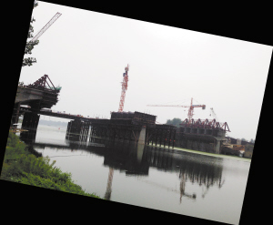 本报讯 8月19日,在周口市中心城区东外环路新建工程(以下简称“东外环路”)跨越沙颍河大桥施工现场,机器轰鸣,工程车辆不停地向施工现场运送建筑材料,整座大桥的桥面即将合拢,从远处已经可以初窥大桥的全貌(如图)。