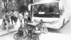 本报讯 昨天上午,一辆从周口开往浙江义乌的大巴车,载着40多名乘客,从周口出发,途经沈丘时被一群人用电动车和摩托车堵住车头车尾。大巴车和车上乘客被困在路上。当地公安、运管部门到达现场了解情况后离开。被困9个小时后,当天18时许,沈丘县运管所工作人员再次来到现场调解,对方才同意放行。