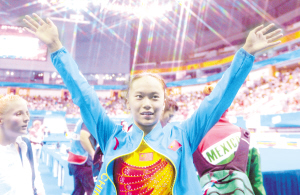 8月21日,中国选手朱雪莹庆祝夺冠。当日,在2014南京青奥会女子蹦床决赛中,中国选手朱雪莹以55.425分的成绩夺冠。新华社记者 程敏 摄