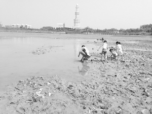 8月25日10时许,记者来到周口公园景观湖旁看到,原本碧波荡漾的景观湖已经消失,只留下了一片一片的小泥塘,湖底的淤泥也露了出来。由于最近天气炎热干燥,高温加剧了湖水的蒸发,湖底原本露出的淤泥已经出现裂缝,让整个湖底看着像一块“湿地”。而在湖底内,数十名市民正卷着裤腿儿、拿着小篓儿在一处处小泥塘内捕捉着田螺和小鱼,还有一些小朋友在湖底的淤泥中玩耍。
