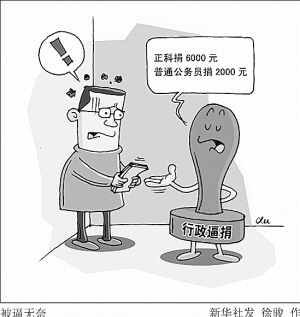 “行政逼捐”花样繁多。“教育资金募捐、乡镇道路改善募捐、治水工程资金募捐等等,也不说你同不同意,上级部门就强行从工资中扣除。”一位公务员告诉记者。“每年单位都会有固定捐款项目,名义自愿,其实不捐根本不行。”在北京某国企工作的陈雨说。