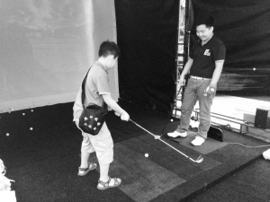 “来,大家跟我做,把右手的小拇指放在左手的中指与食指间,握住球杆……”2014年秋季大型车展暨酒博会现场,许多小记者手握高尔夫球杆向教练学习握杆姿势。据了解,室内模拟高尔夫是仿真室外高尔夫而做的一项室内运动,装置了先进的音响功能,击球的声音、球遇到风摩擦发出的声音、球落水、落地的声音都可以通过音响设备真实发出。“球手与在室外真实击球时一样挥杆,向幕布中的球场击球,画面显示出与真实球场一样的视觉感观。”郑州悦高智动高尔夫公司相关负责人介绍。