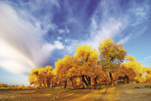 而在海子边有座建于1755年的藏传佛教寺庙,白墙金顶汉藏混合的建筑背靠沙山,面朝湖水,庄严肃穆,幽静典雅,被称为“沙漠故宫”,是巴丹吉林沙漠的地标,亦是牧民心目中神圣的殿堂。到10月,更是沙漠中的额济纳旗胡杨林魅力尽展的最美季节,一夜寒露会骤然把整片的胡杨树全部染黄。古老而沧桑的胡杨林衬托着落日的壮阔景象,沙漠绿洲晚归牧群、秋天里罕见的大漠风光,具有非凡的吸引力。