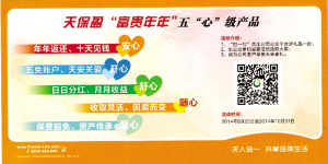 天安人寿优秀产品之一的“天保盈-富贵年年”已经两周年了,该产品凭借“安心、开心、舒心、随心、爱心”五“心”级特点,赢得了广大客户的信赖和喜爱。在这个特别的日子里,天安人寿周口中支为回馈广大新老客户,特推出两周年产品特别活动,扫描左上方的二维码,关注公司公众平台,到公司参加感恩活动,赢取丰厚大奖,活动时间2014年8月25日-2014年10月31日。公司地址:周口市交通大道与建安路交叉口北50米路东。