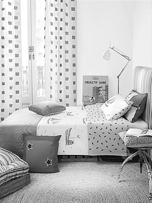 在这个卧室里,底色也是淡淡的,白墙上没有任何的装饰,只是在床品和布艺上花了心思,帆船图案让人的心情似乎也在一起漂流,而靠垫上的红色和五角星图案,则让整个空间年轻了许多。床下的麻编地毯则让人感觉到了空间的温度,红色和条纹的坐垫,都让人能方便地席地而坐。