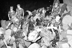 9月3日晚,武警重庆总队三支队官兵将最后一名矿工遗体转移出滑坡地点。
