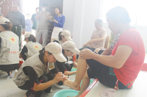 本报讯 9月5日上午,商水县城关乡大刘庄的部分孤寡老人收到一份特殊的中秋节礼物——市红十字会组织十多位爱心志愿者带着慰问品来看望他们,并为他们洗脚。
