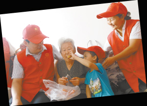 本报讯 9月6日,川汇区人和办事处庆丰社区安置区的102岁独居老人李秀真高兴地吃着志愿者送来的“爱心月饼”,一名小志愿者更是把月饼送到了李秀真老人嘴里(如图)。