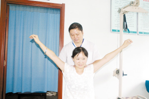 颈椎疼痛、僵硬、活动受限等颈椎疾病让越来越多的上班族痛苦不堪,而且有不断年轻化趋势,如何预防颈椎病的发生和缓解颈椎病症状?周口市疾病预防控制中心专科病医院疼痛科主任蒋卫东告诉大家一个小窍门:把双臂从两侧高举过头,上仰角度与水平线保持30度(即钟表2时与10时位置),每天伴步行300步,可以有效缓解颈椎病症状。图为蒋卫东在为颈椎病患者讲解自身煅炼的要点。