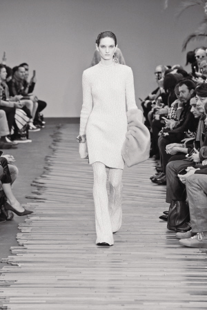 在2014年秋冬的各大品牌中,将针织元素运用得最有味道的还要数赛琳。“大当家”菲比·菲洛抓住了针织衫的结构特点,将品牌上一季就开始追求的“松垮垂坠”继续发挥,并配以轻薄的针织面料,使毛衣“下垂”变成长裙,裤装也将裤脚加肥,变成嬉皮气息十足的喇叭裤型,这样的结构特点反倒将女性的曲线美展露无遗。