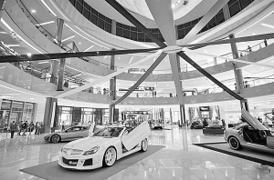 该商场一楼,一辆MINI Cooper180°旋转倒挂在天花板上,相当吸引眼球,大人小孩都可以来玩一把“一手举起一辆车”的抓拍游戏。扶手梯转角处还有一辆“快闪花店”,还原了欧洲花农开着小汽车、载着鲜花去赶集的情景,颇有一番浪漫情怀。原来这是该商场与MINI、苏丽思花艺设计的一次深度跨界合作,周年庆期间,累积消费总额最高的会员可以出半价开走该MINI车。