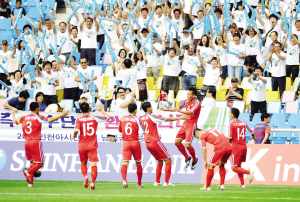 9月15日,朝鲜队球员在比赛中庆祝进球。当日,在韩国仁川举行的第17届亚运会男子足球F组比赛中,中国队以0∶3不敌朝鲜队。新华社记者 黄宗治 摄