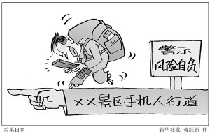 重庆市洋人街景区内专门开辟了一条手机人行道,供在景区内查看手机的“低头族”使用,目的是为减少“低头族”游玩时发生碰撞、摔伤等意外事故。然而,“风险自负”的警示语让人不禁想问,手机人行道究竟是“低头族”的“福利”,还是景区管理划出的免责区域?新华社发 蒋跃新 作