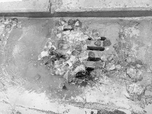 当日9时50分,记者来到汉阳中路,虽然这里窨井的密度没有交通大道大,但这里的积水相对于交通大道来说要少一些。不过记者在路边的道牙处看到,一些路肩挡住了积水流向窨井的去路,由于路肩大小不一,雨水流向窨井的过程十分曲折。即使水流到窨井附近,也很难快速流进窨井,因为有的窨井口被大量的树叶挡住了(图一)。