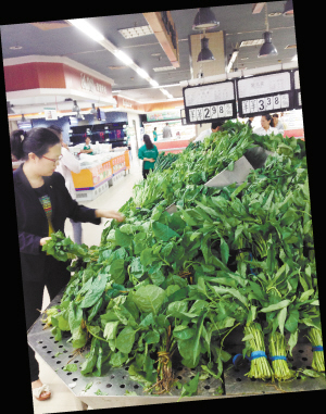 随后,记者来到市区某大型超市,看到超市里的蔬菜区整齐摆放着大量新鲜蔬菜(如图),而在此选购蔬菜的市民均表示叶菜的价格太高了。“怎么涨了这么多啊?”市民李女士说,一周前,香菜卖7.8元/公斤,如今涨到15.96元/公斤。