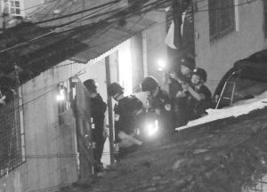 23时30分,大批特警在事发出租屋集结。约5分钟,特警队员逐渐摸索登上居民楼楼顶,并持续借助探照灯进行搜索。23时55分,登上房顶的特警队员,撬开阁楼的铁皮门进入居民楼内,再对起火房间进行搜索。