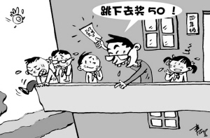 武汉汉阳区一小学班主任发了工资很高兴。他宣布,哪个学生要是敢翻到教学楼二楼走廊栏杆外跳下去,他当场奖励其50元。一名四年级学生经不住诱惑从二楼一跃而下,结果把腿摔断了。